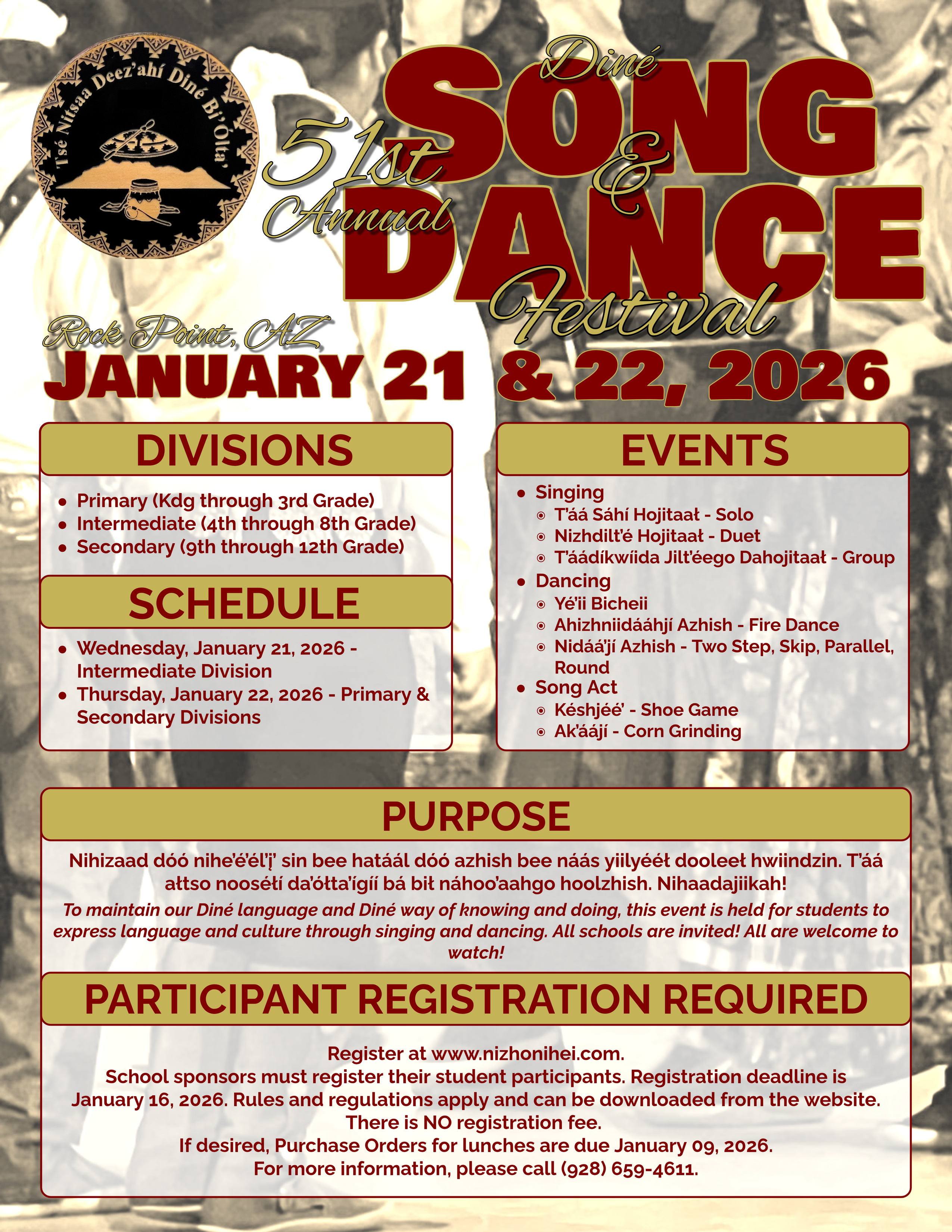The goal of the Diné Song and Dance Festival is to empower our children to continue using our Diné language by demonstrating their Diné cultural talents, knowledge and skills through singing and dancing.